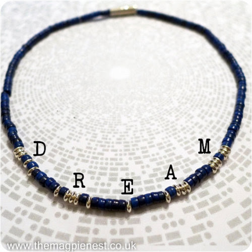 The piece shown here is made from Tibetan silver beads and blue magnesite says “DREAM”. You can select this or choose your own short message and choice of colour.